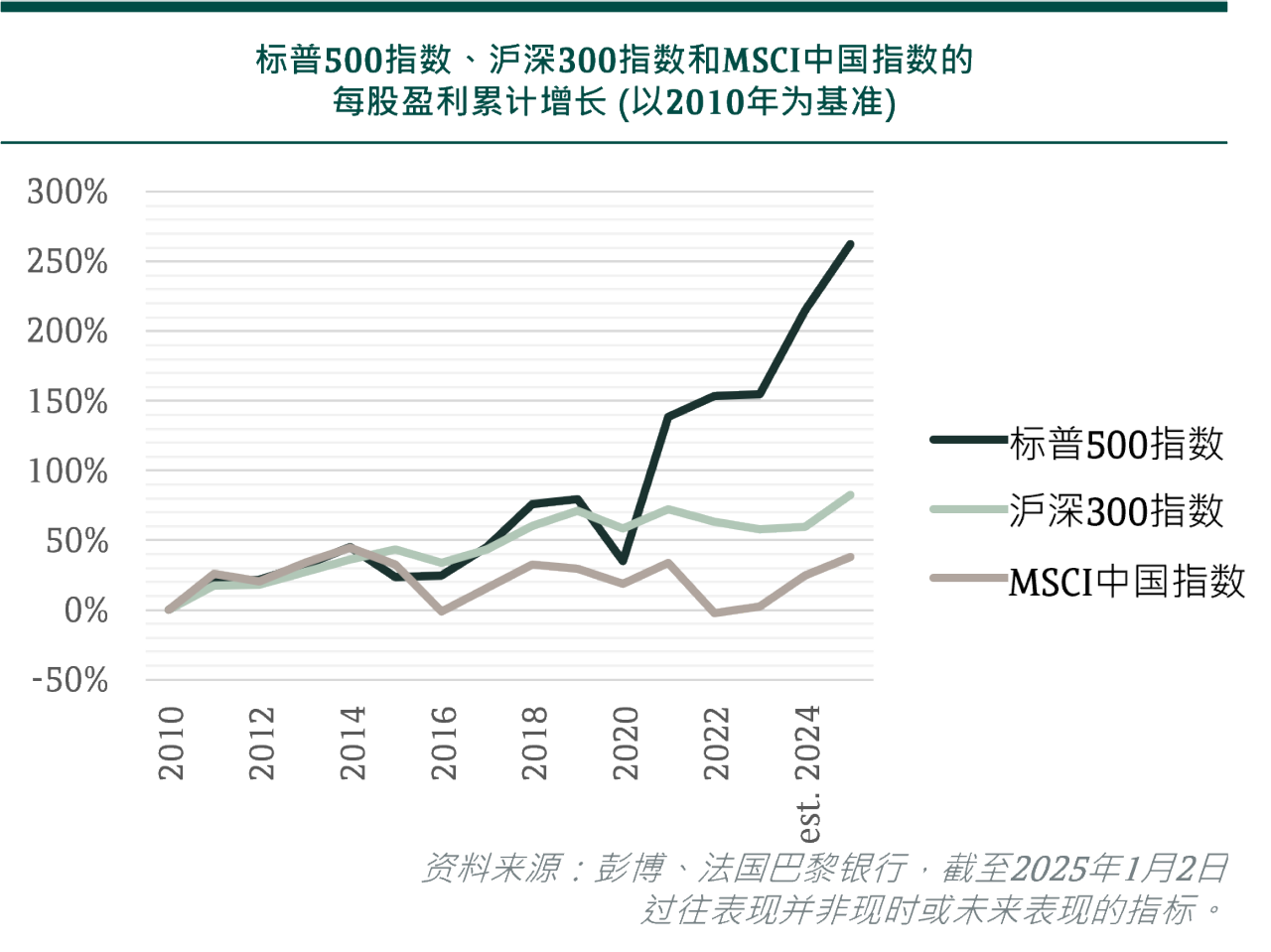 尽管相关刺激措施的细节可能在2025年1-2月召开的省级“两会”期间才会发布,但我们认为重启经济增长引擎为时不晚。过去六年,沪深300指数的每股盈利(EPS)一直停滞不前,而标普500指数的每股盈利则在同期实现巨大跃升。如此来看,放宽货币政策、广推刺激措施和放松管制有助于重振企业盈利增长,这对股市持续造好至关重要。然而,投资者的预期并不低,沪深300指数2025年每股盈利增长共识预期接近15%,为2011年以来最高水平。