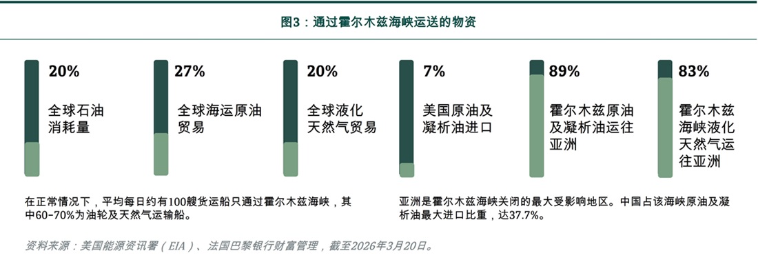 全球经济目前正面临石油供应中断时间超出预期的冲击。事实上,考虑到油轮从中东抵达亚洲通常需时超过一个月(霍尔木兹海峡89%的原油和凝析油是运往亚洲,见图3),东亚地区现在才开始感受到价格上涨的压力。往后,稳定石油价格的关键,将取决于霍尔木兹海峡重开的速度,以及供应能多快恢复至战前水平。当然,这亦取决于当前停火协议不会进一步升级。