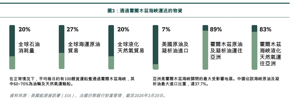 全球經濟目前正面臨石油供應中斷時間超出預期的衝擊。事實上,考慮到油輪從中東抵達亞洲通常需時超過一個月(霍爾木茲海峽89%的原油和凝析油是運往亞洲,見圖3),東亞地區現在才開始感受到價格上漲的壓力。往後,穩定石油價格的關鍵,將取決於霍爾木茲海峽重開的速度,以及供應能多快恢復至戰前水平。當然,這亦取決於當前停火協議不會進一步升級。