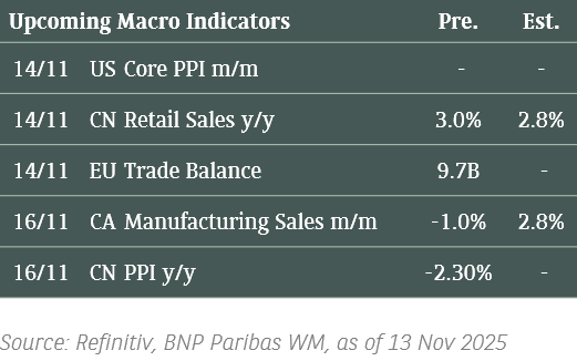The much anticipated PCE inflation figures in the US were in-line with expectations on headline and core. Hence, the December FOMC meeting remains in play with a close call whether the Federal Reserve cuts rates by 25 bps or not. Our base is for a cut. Bond yields continue to drop after the figures. The back up in yields that we saw a few weeks ago are good opportunities to add to bond exposure. In the US, markets will be closed on Thanksgiving today and will have shortened trading hours on Friday.