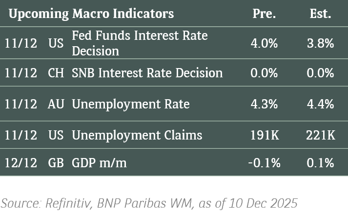 The 10-year Treasury yield is expected to remain range-bound between 4.1% and 4.2% ahead of the upcoming FOMC meeting. A surprising US CPI print on Wednesday could temporarily break this range, prompting portfolio rebalancing and a reduction in long-dated bonds. For now, we prefer buying investment-grade bonds with maturities of five years or less for carry.