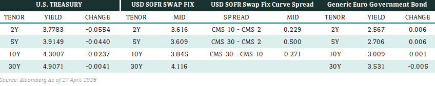 Primary markets continue to show resilience in the face of trade tariff policy headlines and a busy earnings season. With 10-year U.S. Treasury hovering lower at ~4.42% during U.S. hours, there were a total of USD 16.7 billion of issuance including UBS' two-tranche AT1 CoCo perpetual, Citigroup's perpetual (preferred), and multi-tranche offerings from IBM and Pepsico. A total of USD 30 billion to USD 35 billion in new issue supply is expected this week, ahead of this Friday's U.S. nonfarm payrolls data. Despite minimal new issue concessions, we expect spreads to continue to grind tighter in the near-term.