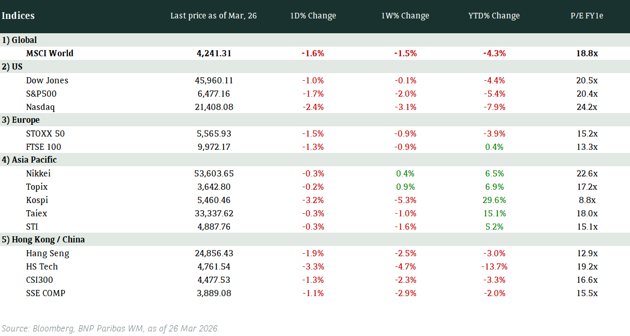 Market selloff extended on Tuesday, amid global trade policy uncertainty which is reigniting fears of a global economic slowdown. US equities recovered slightly from initial losses, but investors continue to be cautious of the current trade situation. This was after US President Trump reversed his earlier threat to double tariffs on steel and aluminum from Canada to 50%, following Ontario Premier Doug Ford suspension of a retaliation move of 25% surcharge on power exports, as a meeting between Ontario Premier Ford and US Commerce Secretary Howard Lutnick on Thursday was announced. We think volatility is likely to remain high, particularly in the US due to policy uncertainty, hence we switch to view from positive to neutral on US equities.