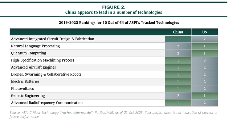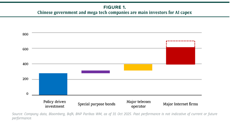 In the recent Fourth Plenum, Beijing outlined the 15th Five-Year Plan with the main focus on technological self-sufficiency. China leads globally with abundant and cost-efficient renewable energy and grid infrastructure to support the rising power demand driven by the strong AI demand. China is also a global producer for AI-integrated humanoid robots and smart service devices. China’s AI capex is estimated to reach RMB 600-700bn this year (see Figure 1), and a very large domestic market helps support commercialisation and scaling up of local technology brands.