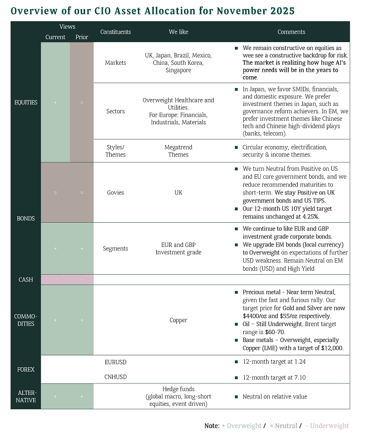 Hong Kong market saw record net Southbound flows of USD 162 Billion (as of end-Oct 2025) from the Mainland YTD. We continue to see potential for the ongoing strengthening in domestic investor confidence on Hong Kong and China A-shares markets, which implies increasing reallocation of excess savings into equity markets. We also believe China equities would be increasingly back to global investors’ radar screen given their diversification demand, more reasonable relative valuations and persistent underweight allocations to China.