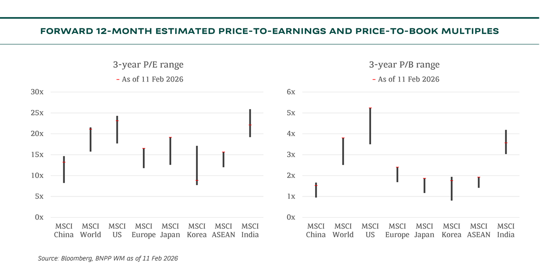 Key to the earnings picture will be whether currently challenged sectors (e.g. Autos, Chemicals, Media, Consumer Staples) significantly recover in 2026, while they still face major disruptions coming from AI, China and new consumption habits. We have seen downward earnings revisions to companies with high US exposure, given the strength in the Euro, and this will be a focus going into 2026. Nonetheless, stronger European GDP growth should support, with consensus expecting earnings growth of ~10% in 2026. European stocks still trade at reasonable valuation levels (the Stoxx 600’s Price to Earnings (P/E) of 15.8x, as of 13 February 2026).