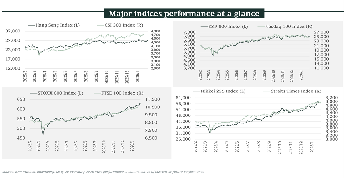 US equities have been largely rangebound so far this year (as of 19 Feb 2026), which have underscored our selective stance on the equity market. Sector returns have been quite divergent, with double-digit percentage gains so far this year for Energy, Materials, Industrials and Consumer Staples, which we believe reflect investors’ efforts to diversify their portfolio exposures amid longer term AI disruption worries and spike in geopolitical tensions after the US intervention in Venezuela early this year.