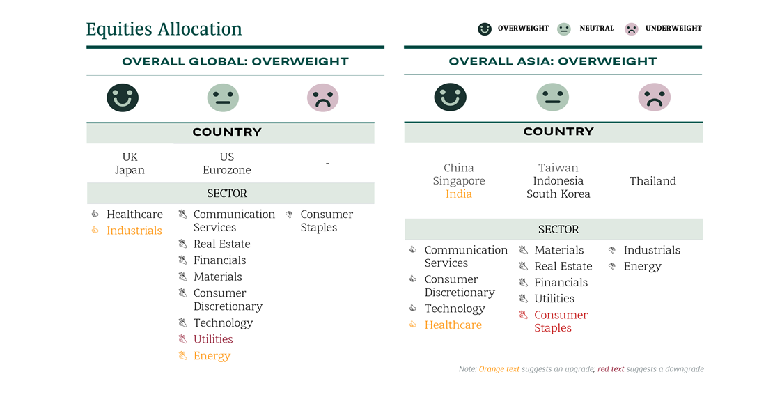 - We are selective on US and EU stocks, with relative preference on quality leaders and strong balance sheets, as well as domestic European businesses geared towards the region’s supportive fiscal policies.