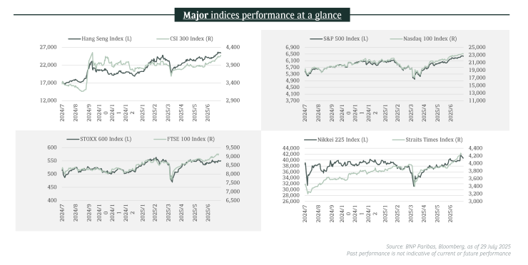 As the Q2 reporting season starts, we note that MSCI US earnings growth is forecast at 9% and 14% for FY25 & FY26 respectively in a backdrop of uncertainties over how much tariff costs could weigh on corporate profits and margins. Hence, the trajectory of earnings revisions in the next few reporting seasons and the extent of Fed rate cuts will be important for indications on whether the recent bounce in equities can be sustained, which should be influenced to a large extent by how trade policy negotiations pan out.