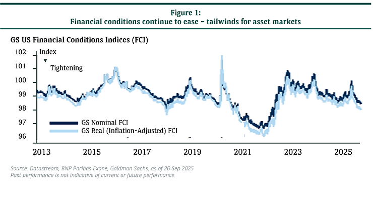 Credit spreads are tight, and the US dollar has weakened. This combination boosts global liquidity and allows emerging market central banks to join in the rate-cutting cycle. The loosening of financial conditions is typically a leading indicator, though it tends to act with a lag. As a result, global equities could see a further boost in the fourth quarter, despite already strong performance year-to-date.