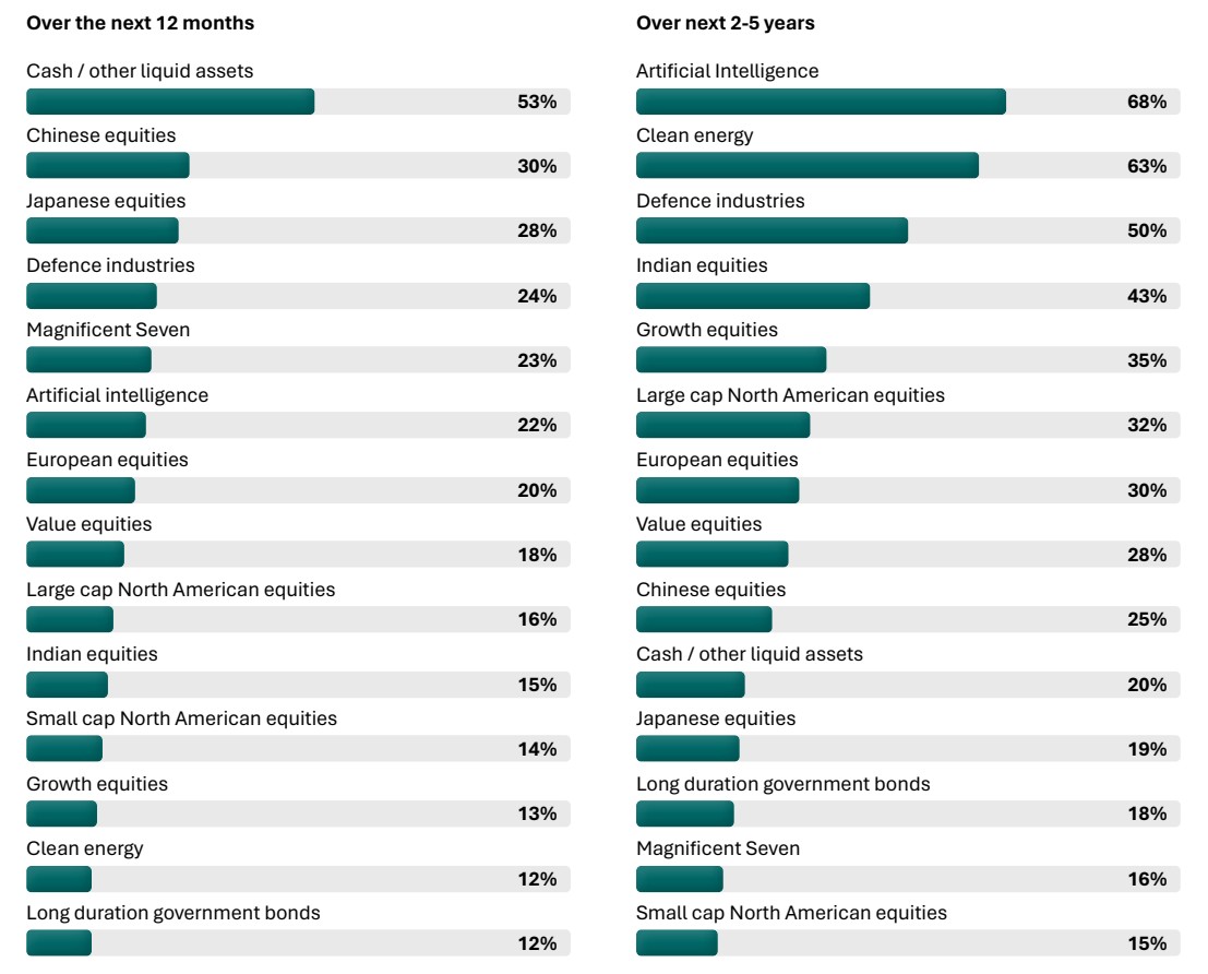 The report, sponsored by BNP Paribas Wealth Management and produced by Campden Wealth reveals a more cautious approach compared to 2024, when growth equities was the dominant theme. In contrast, cash and liquid assets are the top-ranked asset class for the next 12 months (Fig. 1), alongside a clear shift toward balanced portfolio strategies, at the time of the survey, which took place between March and June 2025. Respondents’ average expected return for 2025 is approximately 6%, reflecting tempered expectations and a focus on resilience amid heightened market volatility.