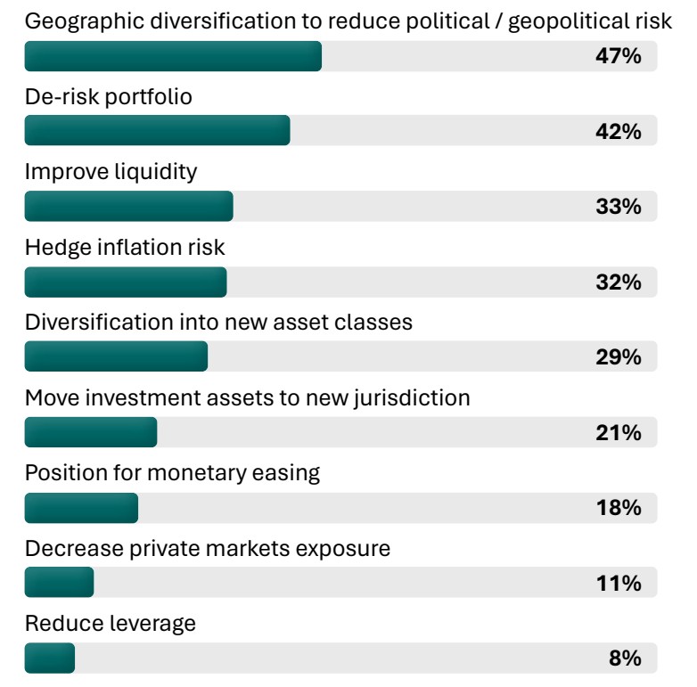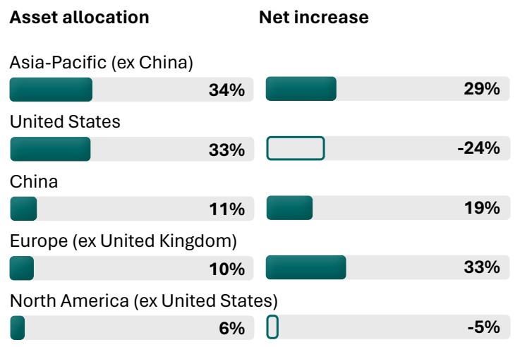 While the United States remains a significant allocation at 33% of current geographic exposure (Fig. 4), the report indicates a net intention to reduce US exposure (−24%) (Fig. 5) consistent with broader diversification and risk management objectives. These intentions align with the respondents stated objectives around diversification and risk management.