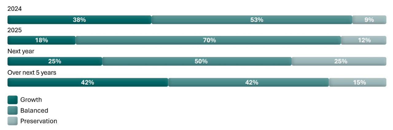 Family offices cite portfolio construction goals that emphasise risk management and flexibility. The report finds that the respondents’ primary 2025 objectives were: geographic diversification to reduce concentration risk (47%), de-risking portfolios (42%) and improving liquidity (33%) (Fig. 2). This is reflected in strategy choices with balanced strategies rising to 70% in 2025, up from 53% in 2024. (Fig. 3).